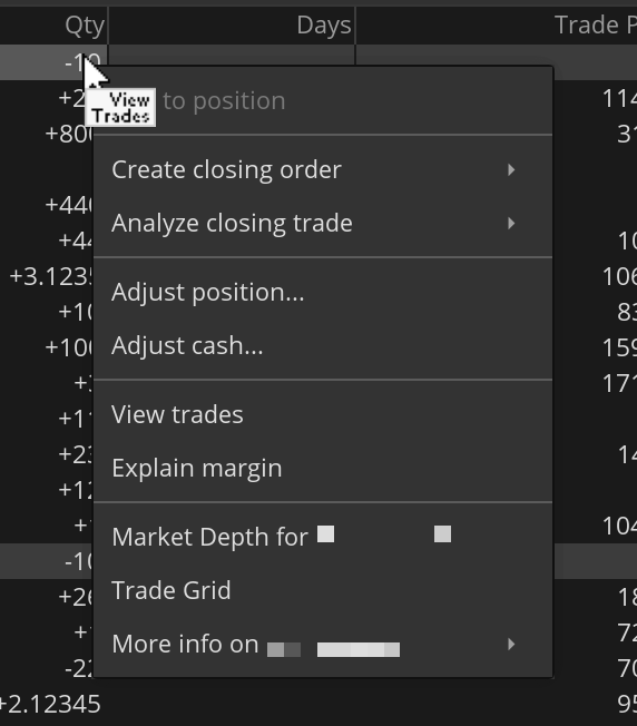 - Hover over a position and left-click it. Alternatively, right-click a position to open the menu with additional tools, then click View trades.