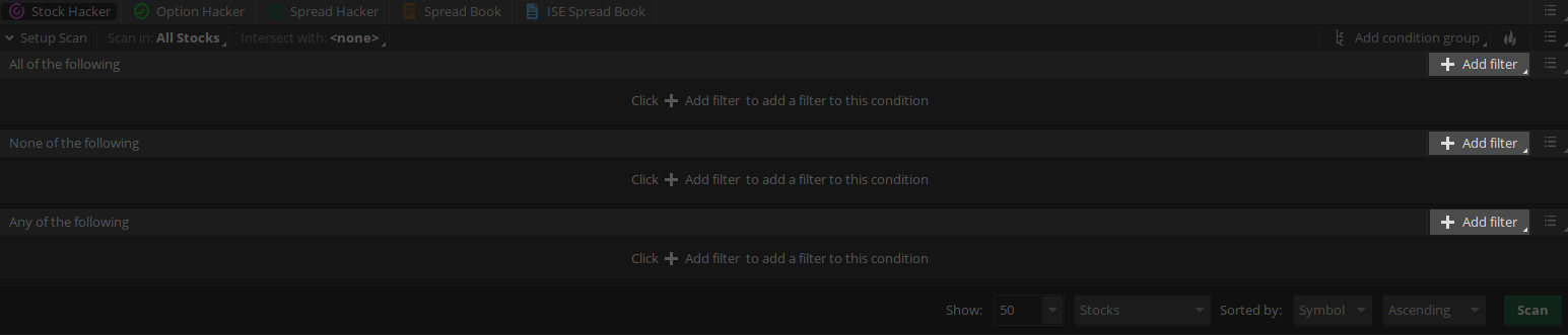 The Stock Hacker Scanning Tool allows you to search for symbols meeting certain criteria. Study filters are criteria based on study values: adding one or several study filters will help you narrow the search range when looking for symbols. You can use up to 25 filters to scan the market.