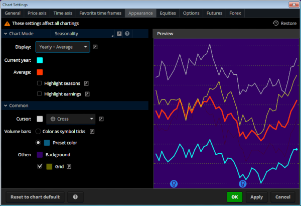 While keeping many features of the standard chart mode, Seasonality charting has several peculiarities. Since multiple data points are plotted for a single time interval, the volume is not shown. For the same reason, studies cannot be applied to Seasonality charts. Instead, Appearance settings allow you to view the yearly lines along with their averages. You're also free to add several types of drawings to the Seasonality chart: Trendline, Price Level, Time Level, Text Note, Arrow, Oval, Rectangle, Channel, Fibonacci Retracements, Fibonacci, Extensions, Fibonacci Fans, and Andrew's Pitchfork. In addition, you can have the Seasonality chart display available corporate actions; to do so, navigate to the Equities Settings dialog and select Show Corporate Actions.