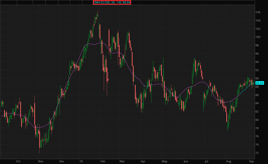 The Displaced Moving Average is a study which calculates a Simple Moving Average and shifts it forward or backward in time for a specified period. Note that due to displacement, the study plots effective SMA value with reduced length for last bars.