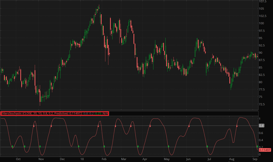 Ehlers' Stochastic oscillator is analyzed in relation to overbought and oversold levels, with two modes of analysis: conventional and predictive. In conventional mode, a Buy signal is indicated when Ehler's Stochastic crosses above the oversold level and a Sell signal is shown when it crosses below the overbought level. For the predictive mode, crossover directions are inverse: Buy signal is issued when the Stochastic plot crosses below the oversold level and Sell signal is shown when it crosses above the overbought level.
