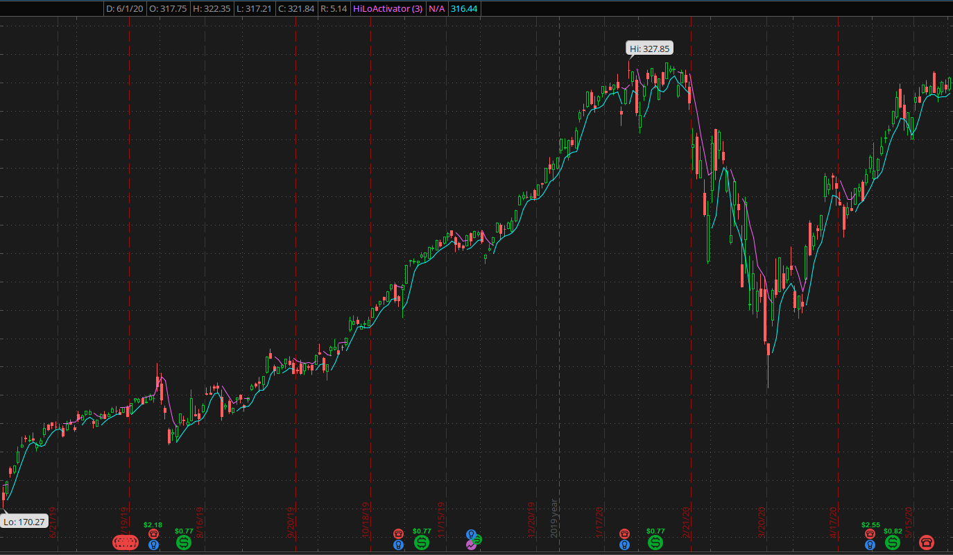 The HiLo Activator study is a trend-following indicator introduced by Robert Krausz as part of the Gann Swing trading strategy. In addition to indicating the current trend direction, this can be used as both entry signal and trailing stop.