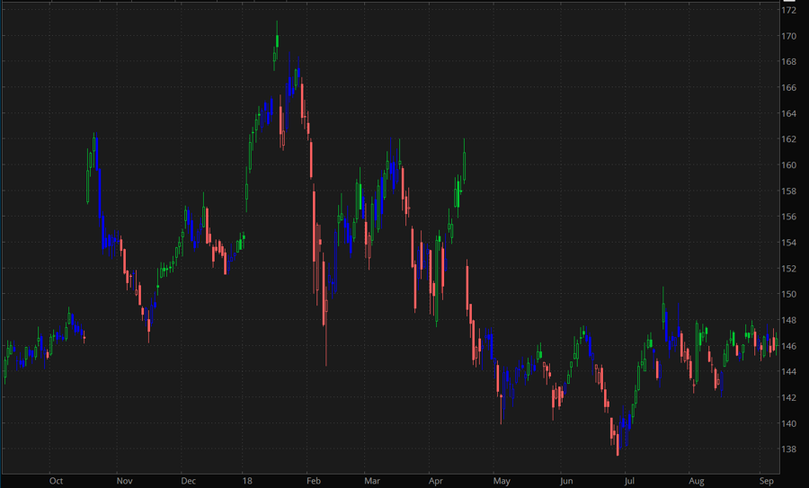 The Impulse study is a bar coloring system based on two indicators: EMA and MACD Histogram; for MACD Histogram, values (12, 26, 9) are used as input parameters. A bar is painted green if both MACD and EMA values are higher than those of the previous bar. A bar is painted red if both MACD and EMA values are lower than those of the previous bar. A bar is painted blue if neither of the two conditions is fulfilled.