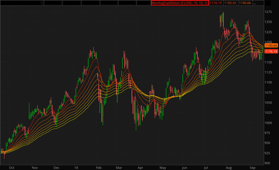 Parallel long-term Ribbon lines signal a strong trend. Both groups of Ribbon lines converging and fluctuating more than usual is a sign of trend weakness. A change in price direction accompanied by expanding Ribbon lines in both groups is a sign of a trend start. During a short-term reversal, the short-term group crossover, diverge and then again converge, while the long-term group remain parallel.