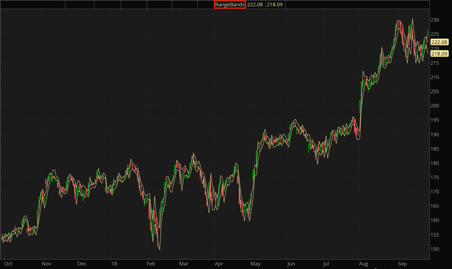 The Range Bands study is a technical indicator which is intended to predict the range of the next bar based on the relationship between current Open and Close prices.