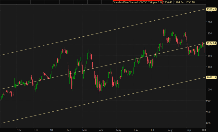 The Standard Deviation Channel is composed of two lines parallel to the Linear Regression Trendline and distanced from it by specified number of standard deviations. Upper line is placed above the trendline; lower line, below.