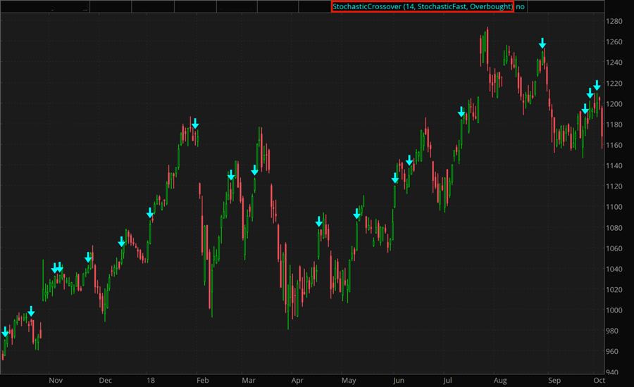 The Stochastic Crossover study is a technical indicator which finds where either Stochastic Slow or Stochastic Fast crosses overbought (80%) or oversold (20%) level.
