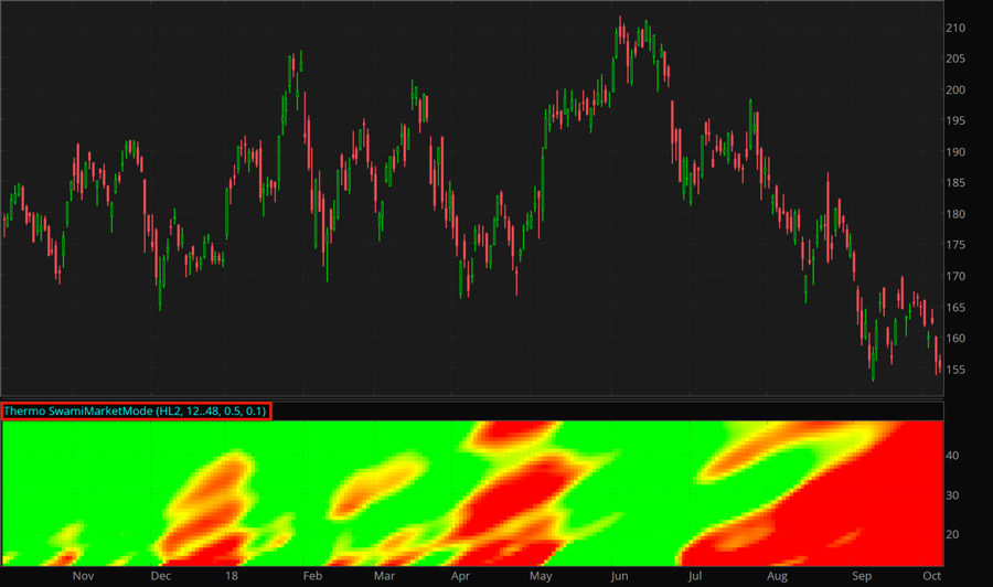 The Swami Market Mode study is a technical indicator designed for Thermo Mode; it is used for trend detection and analysis. Like in all Thermo Mode specific studies, shorter lookback periods reflect recent changes, middle range periods are used for confirmation, and the longest ones signify possibility of continuation.