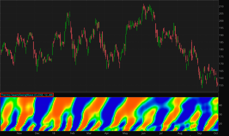 The Swami Swing Wave study is a technical indicator designed for Thermo Mode; it analyzes price action to isolate short-term wave peaks and troughs. Like in all Thermo Mode specific studies, shorter lookback periods reflect recent changes, middle range periods are used for confirmation, and the longest ones signify possibility of continuation.
