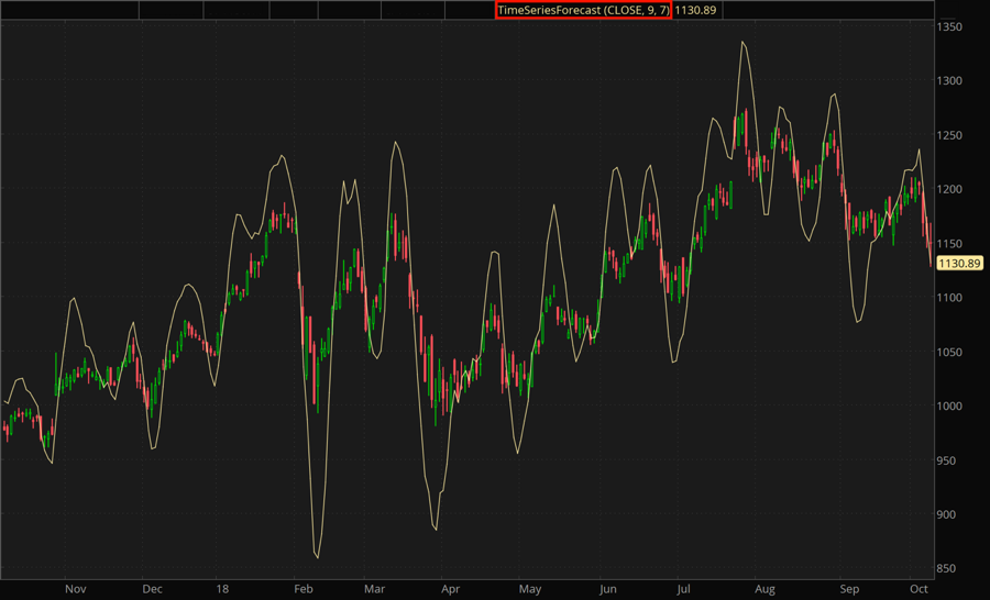The Time Series Forecast study is a technical indicator displaying the statistical trend based on linear regression analysis using the least squares method. Time Series Forecast partially eliminates time lagging effect occurring in Moving Average studies as linear regression value is as close as possible to the values being averaged.