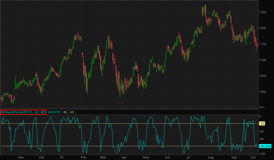The Williams Percent R is a lower study. It is a momentum indicator that is designed to identify overbought and oversold areas in a non-trending market. The Williams Percent R can be interpreted similarly to the Stochastic oscillators but the Williams Percent R is simply plotted upside-down. Readings in the range of -80 to -100% may indicate that the security is oversold while readings in the 0 to -20% range suggest that it is overbought.
