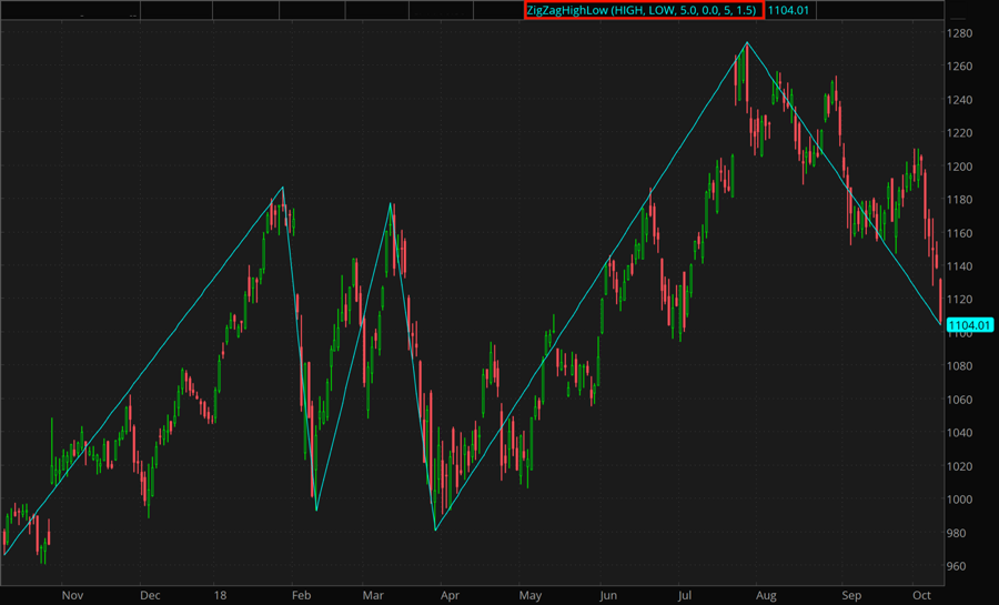 A high swing point is a bar with a selected price (high, low, open, or close) greater than that of the previous and the following bar. Conversely, a low swing point is a bar with a selected price lower than that of the previous and the following bar. Once all the irregularities are smoothed out, the study plot is a zigzag line showing generalized price moves up and down.